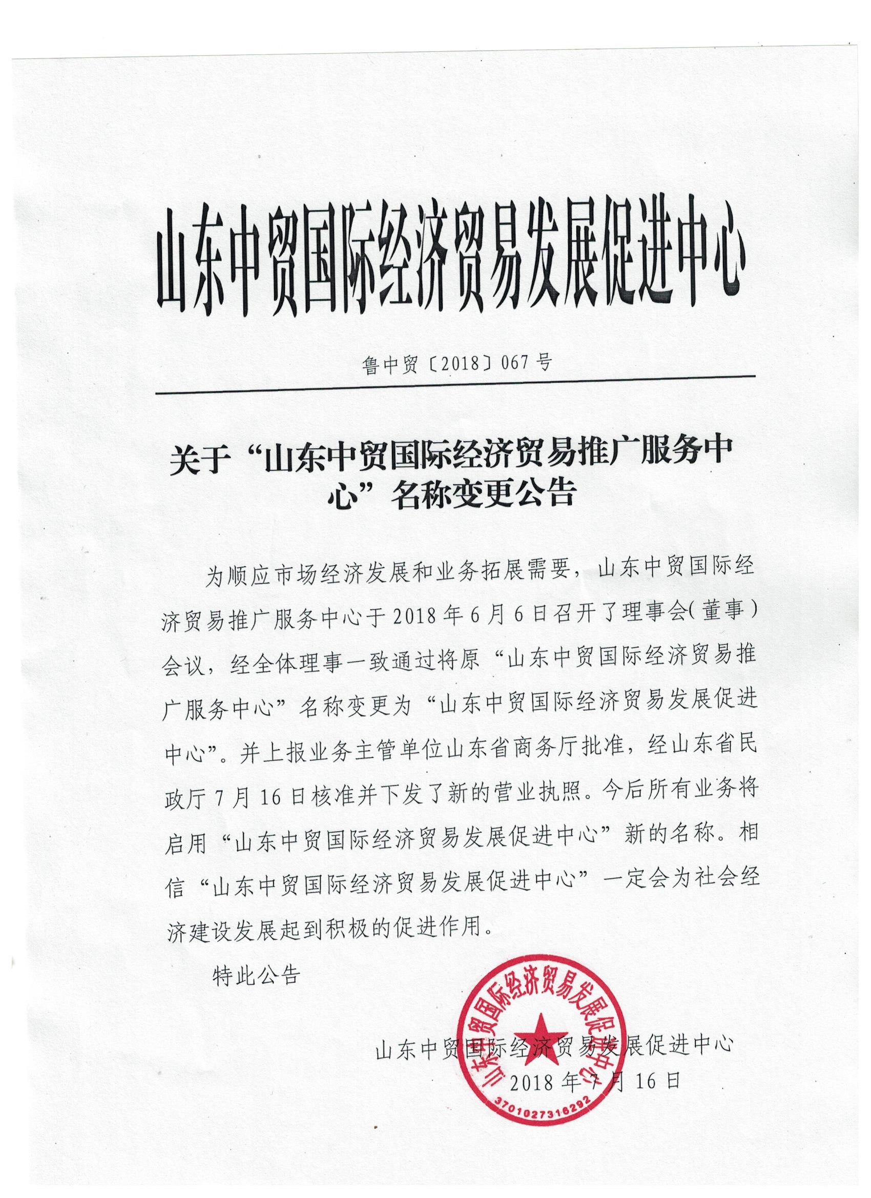 關(guān)于“山東中貿(mào)國(guó)際經(jīng)濟(jì)貿(mào)易推廣服務(wù)中心”名稱(chēng)變更公告